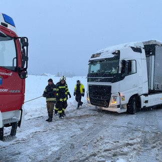 Auf tief verschneiter Fahrbahn kam ein LKW bereits in den Mittagsstunden zum stehen. Nach vergeblichen Anfahrversuchen ohne Ketten blieb der LKW zusätzlich noch in der Wiese hängen.